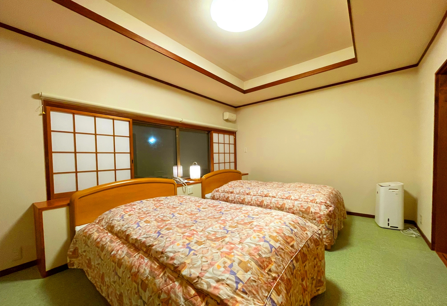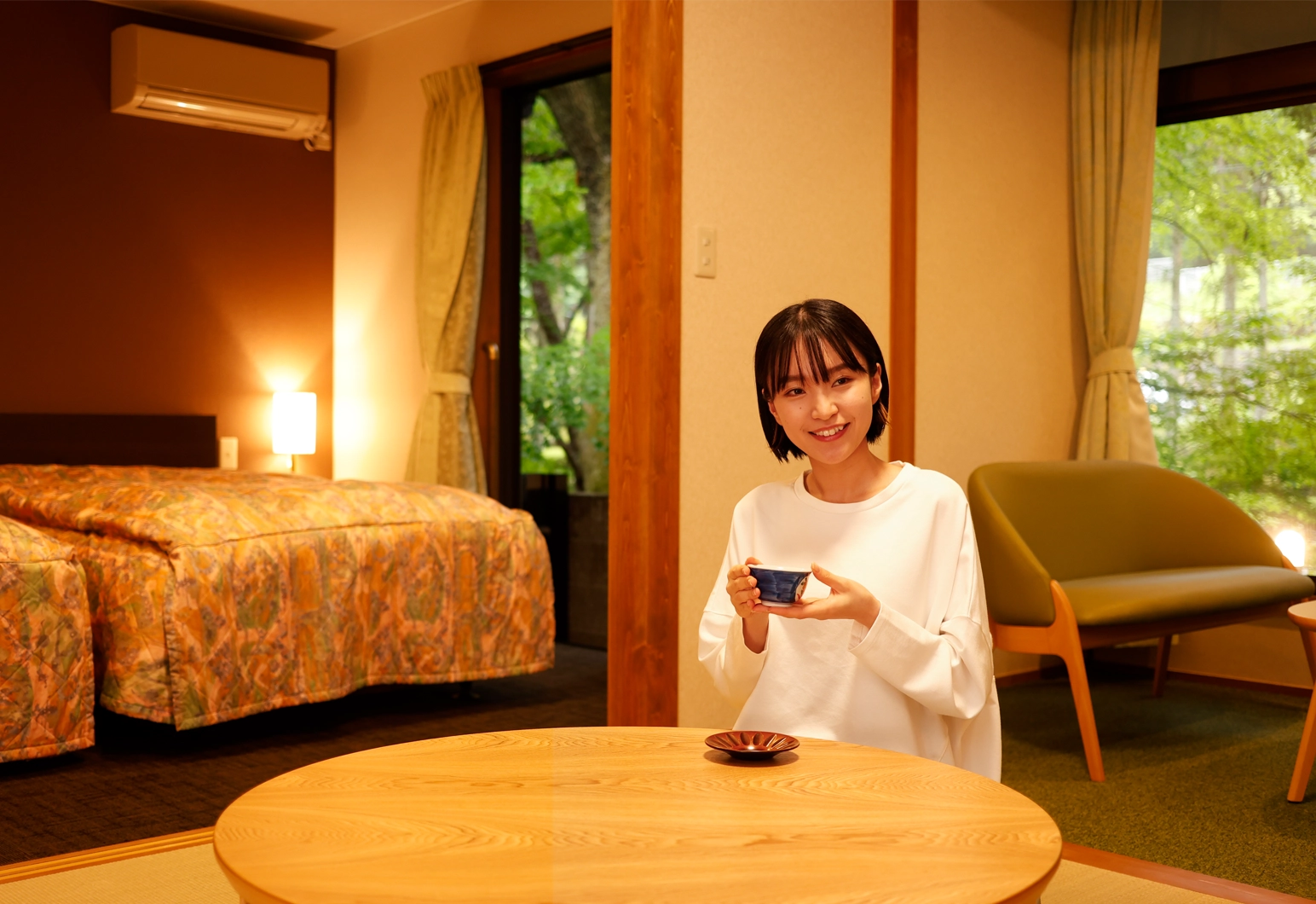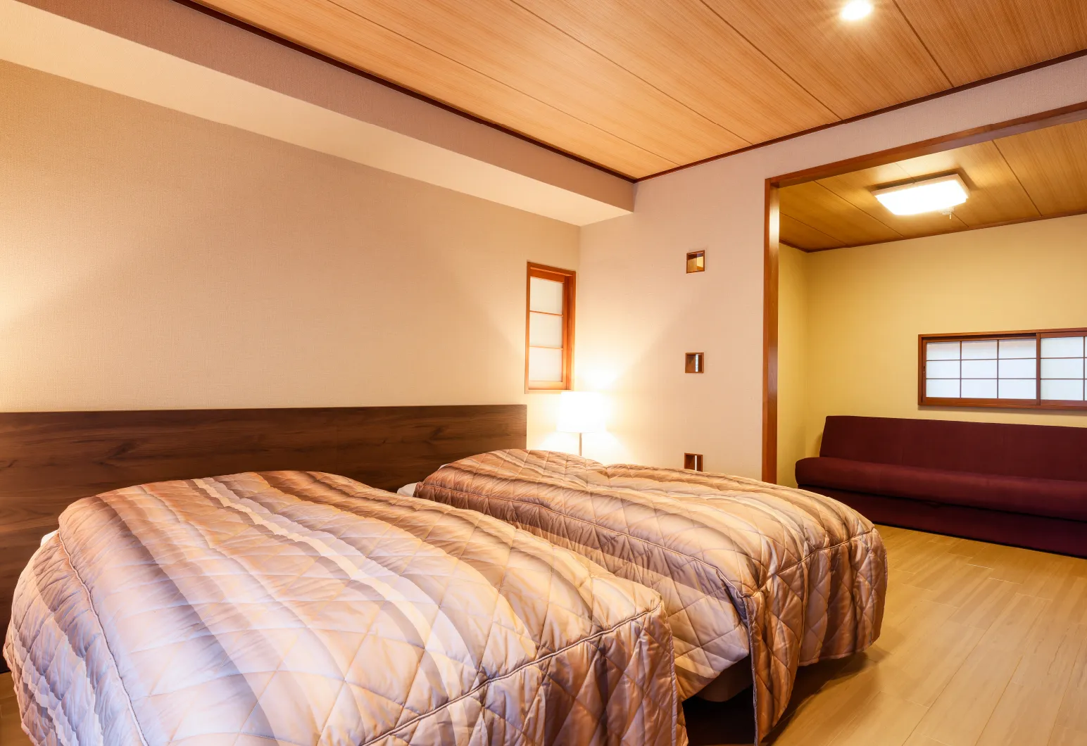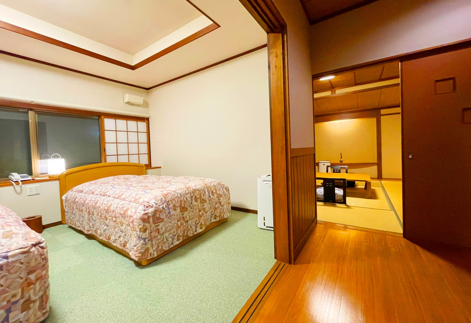 「ベッドルームのある広々とした洋室と、6帖の和室のついた空間です。ご家族・グループでの宿泊におすすめ、別荘タイプの離れです。 (3名様~4名様でのご宿泊の場合はベット2台とお布団となります)