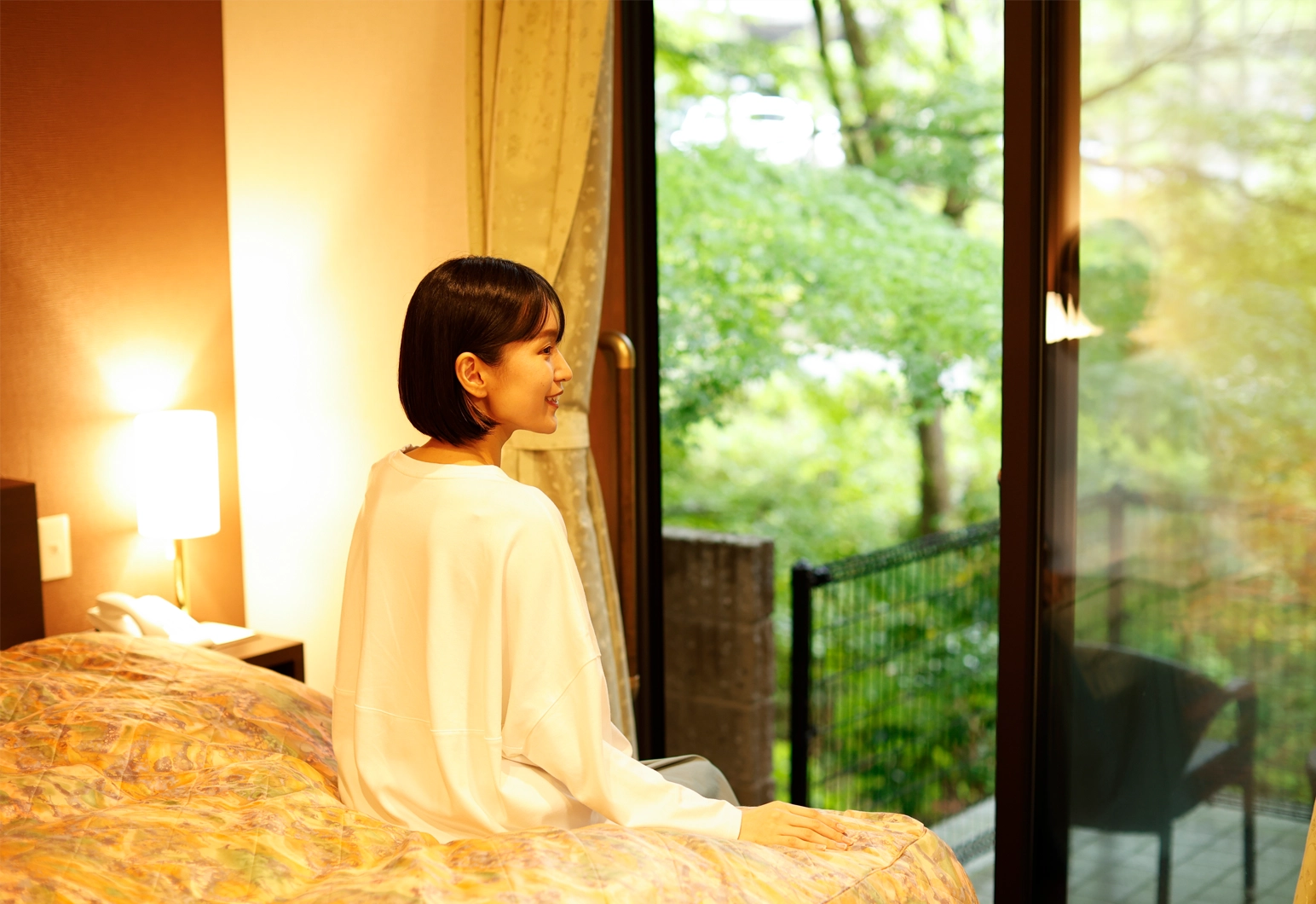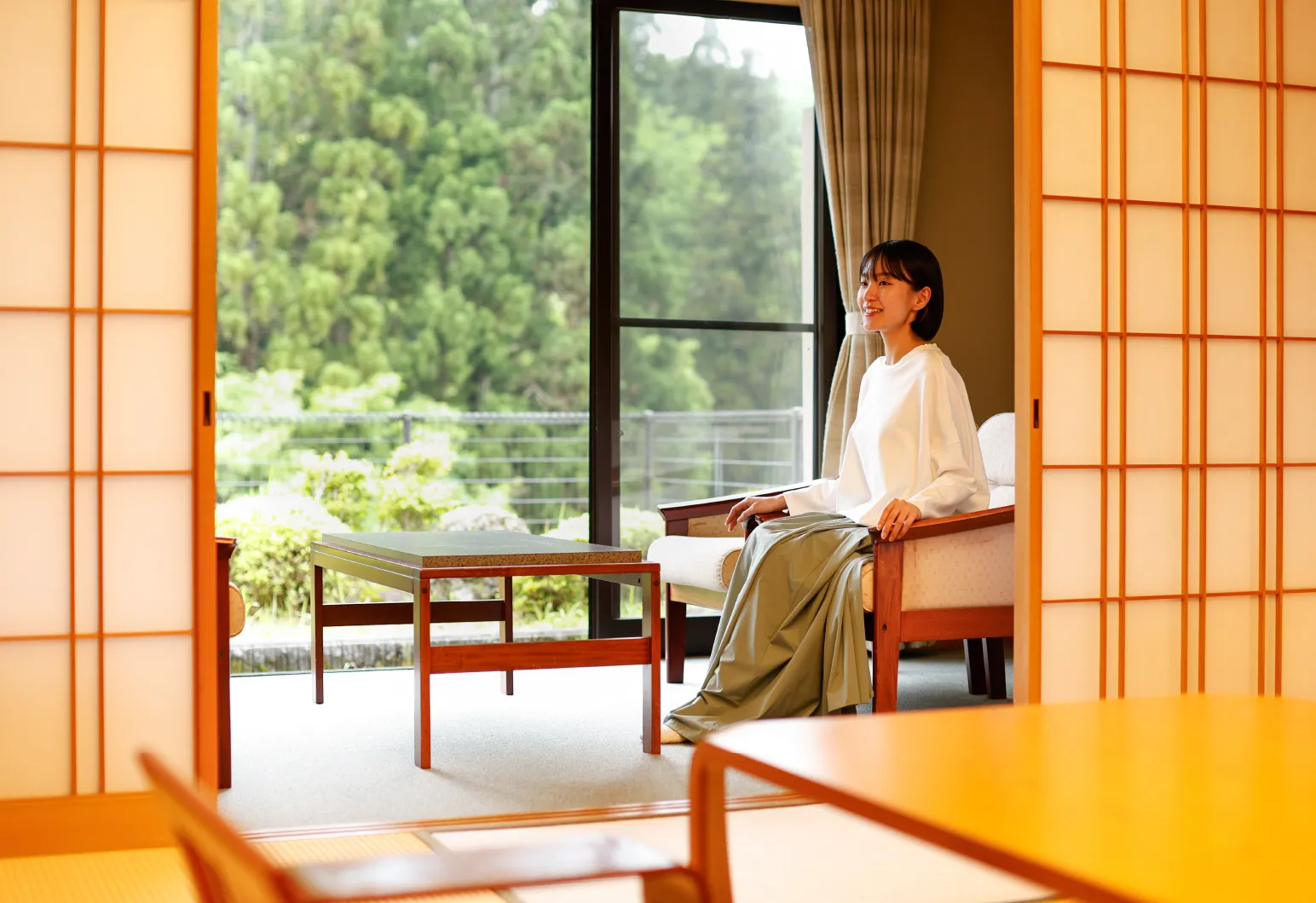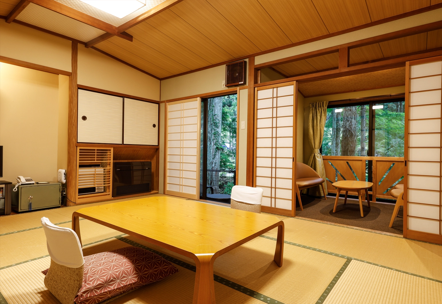 「ベッドルームのある広々とした洋室と、6帖の和室のついた空間です。ご家族・グループでの宿泊におすすめ、別荘タイプの離れです。 (3名様~4名様でのご宿泊の場合はベット2台とお布団となります)